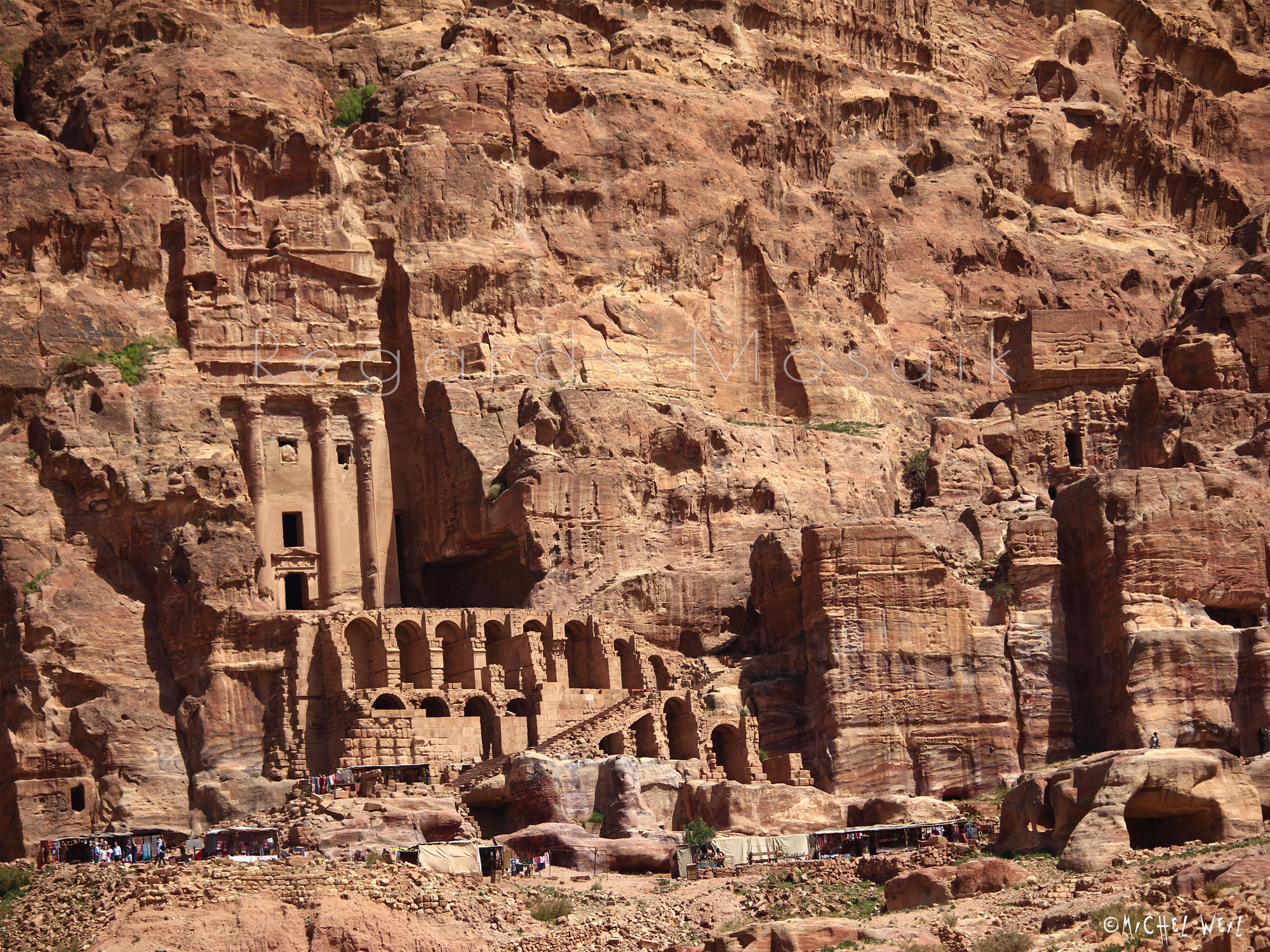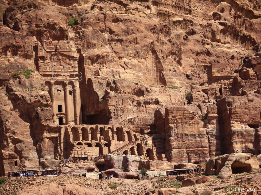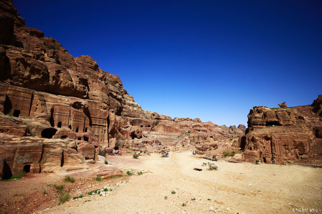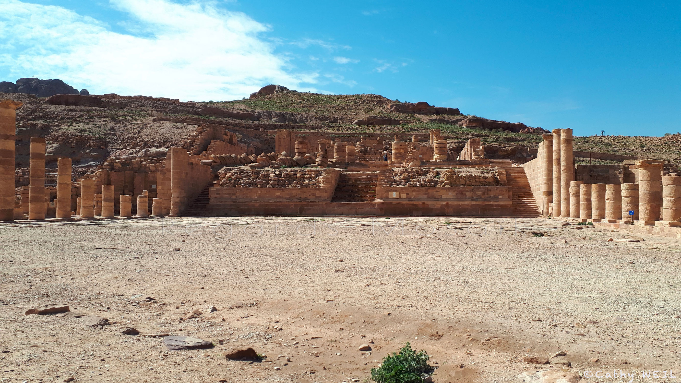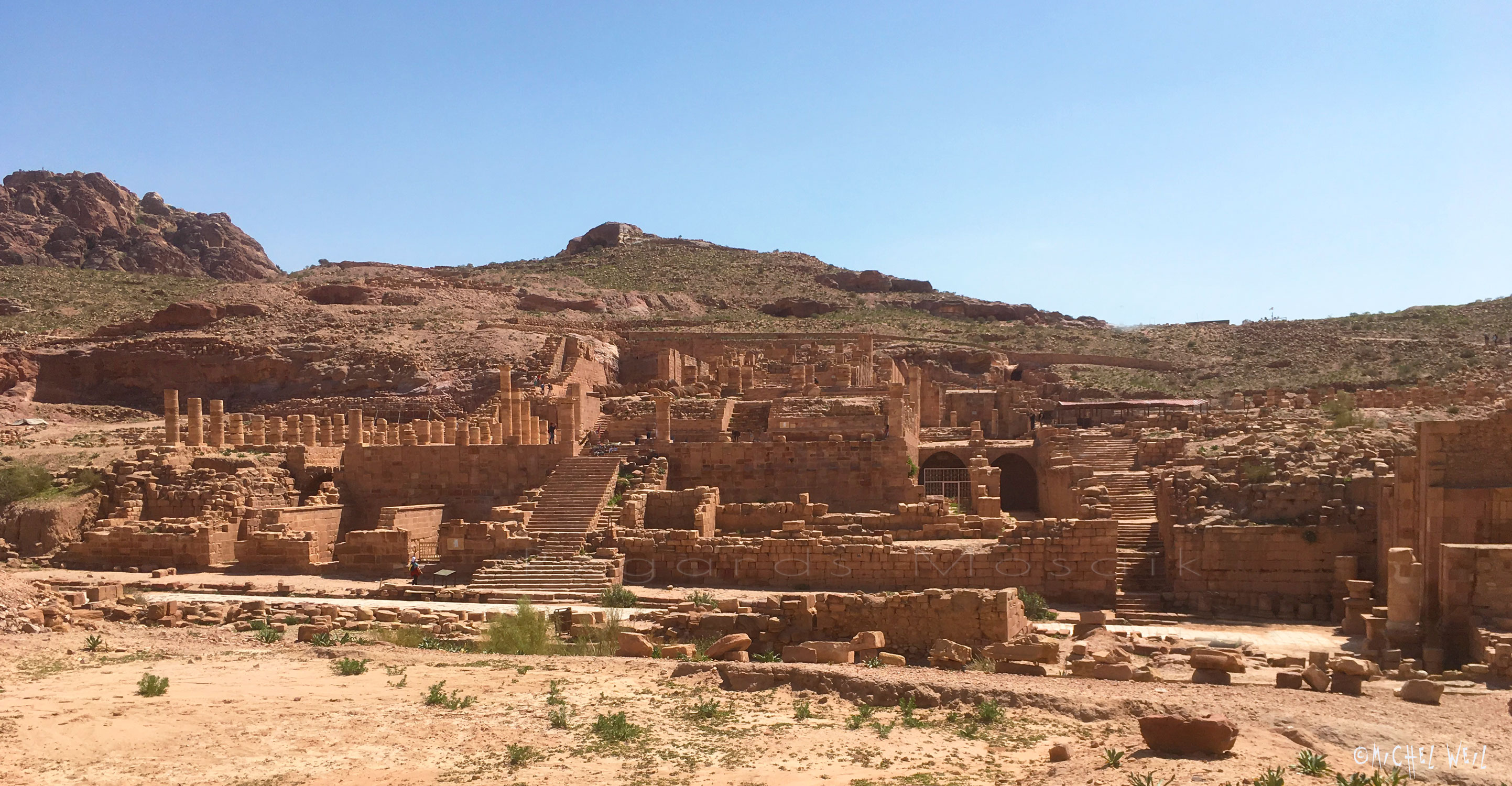 Et l’on découvre partout taillés dans la montagne de nombreux tombeaux ainsi que le théâtre. Le cours du wadi Mousa change d’orientation pour se diriger vers le nord sur quelques centaines de mètres, avant de reprendre son trajet sur un axe est-ouest, là où se trouve le centre de Pétra, avec ses principaux ensembles monumentaux.