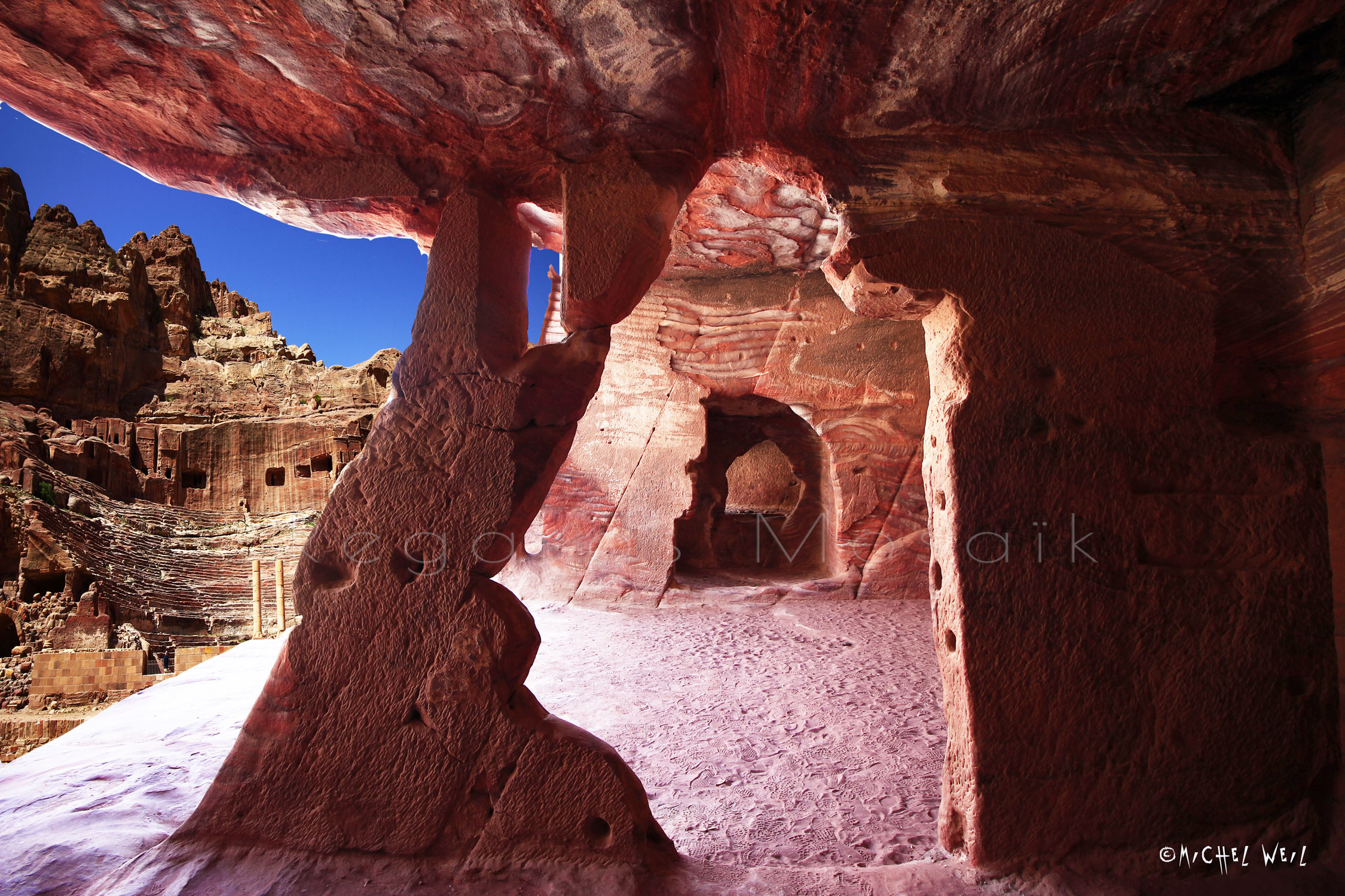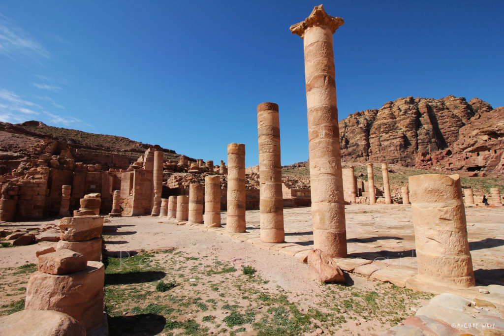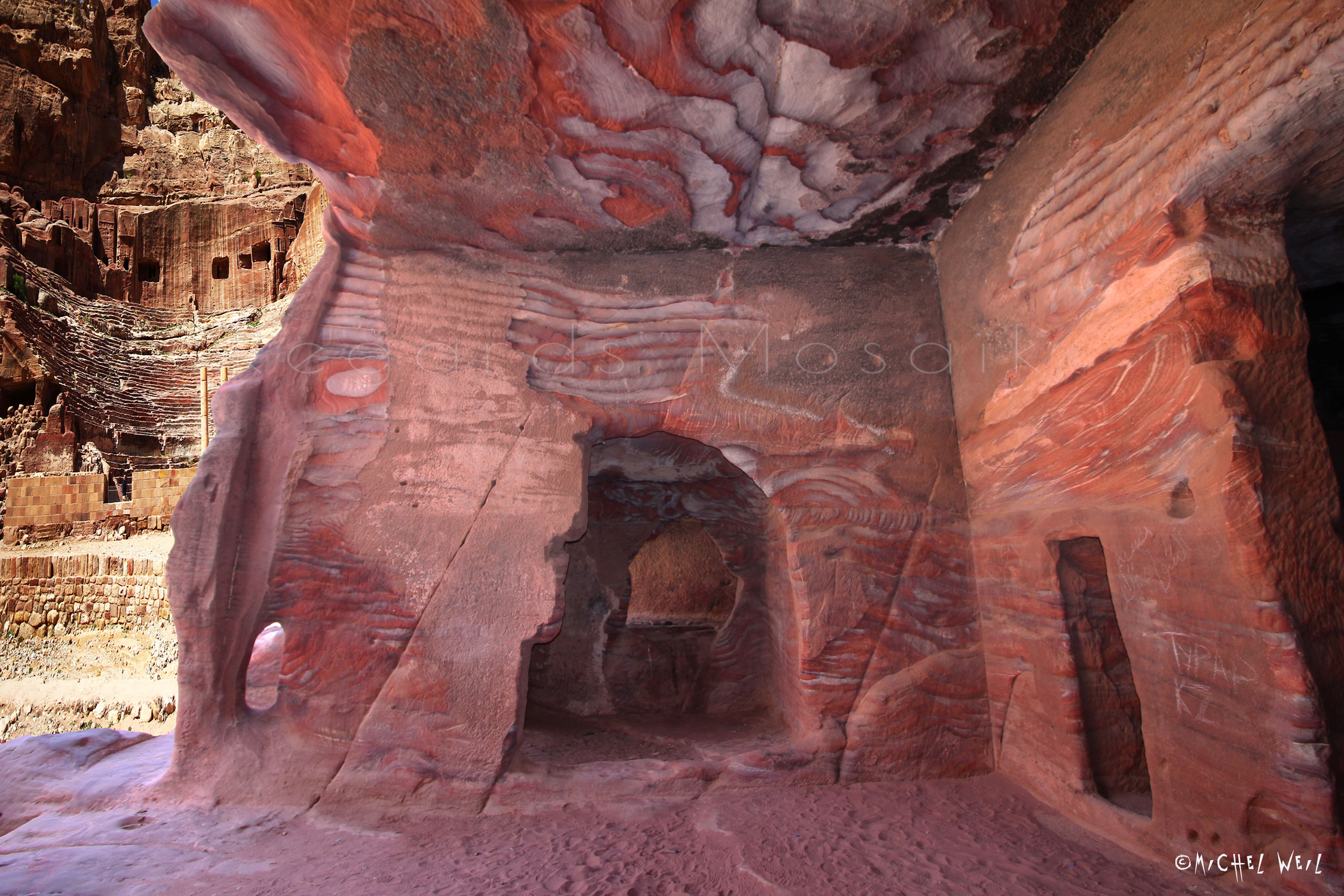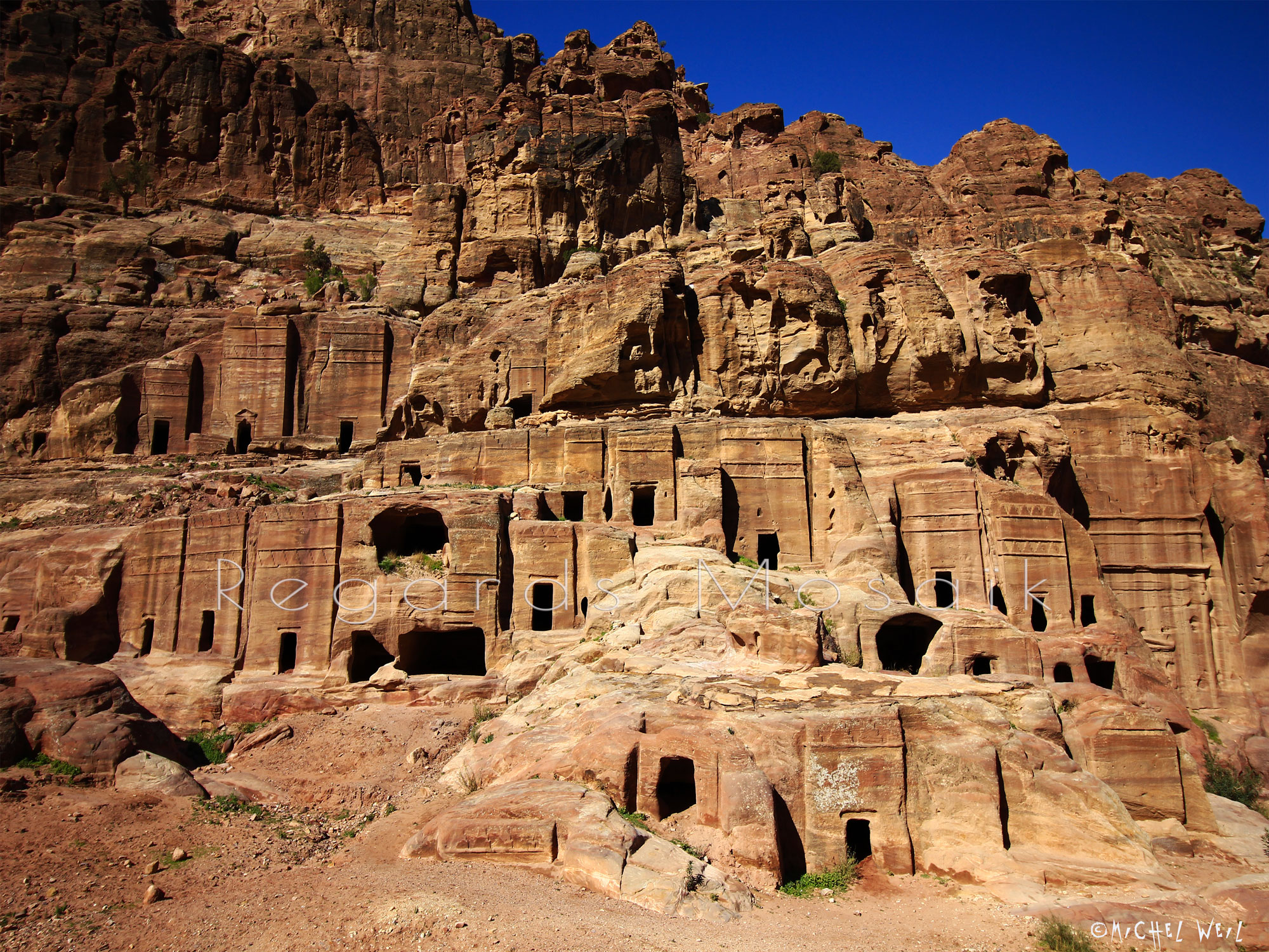 Et l’on découvre partout taillés dans la montagne de nombreux tombeaux ainsi que le théâtre. Le cours du wadi Mousa change d’orientation pour se diriger vers le nord sur quelques centaines de mètres, avant de reprendre son trajet sur un axe est-ouest, là où se trouve le centre de Pétra, avec ses principaux ensembles monumentaux.