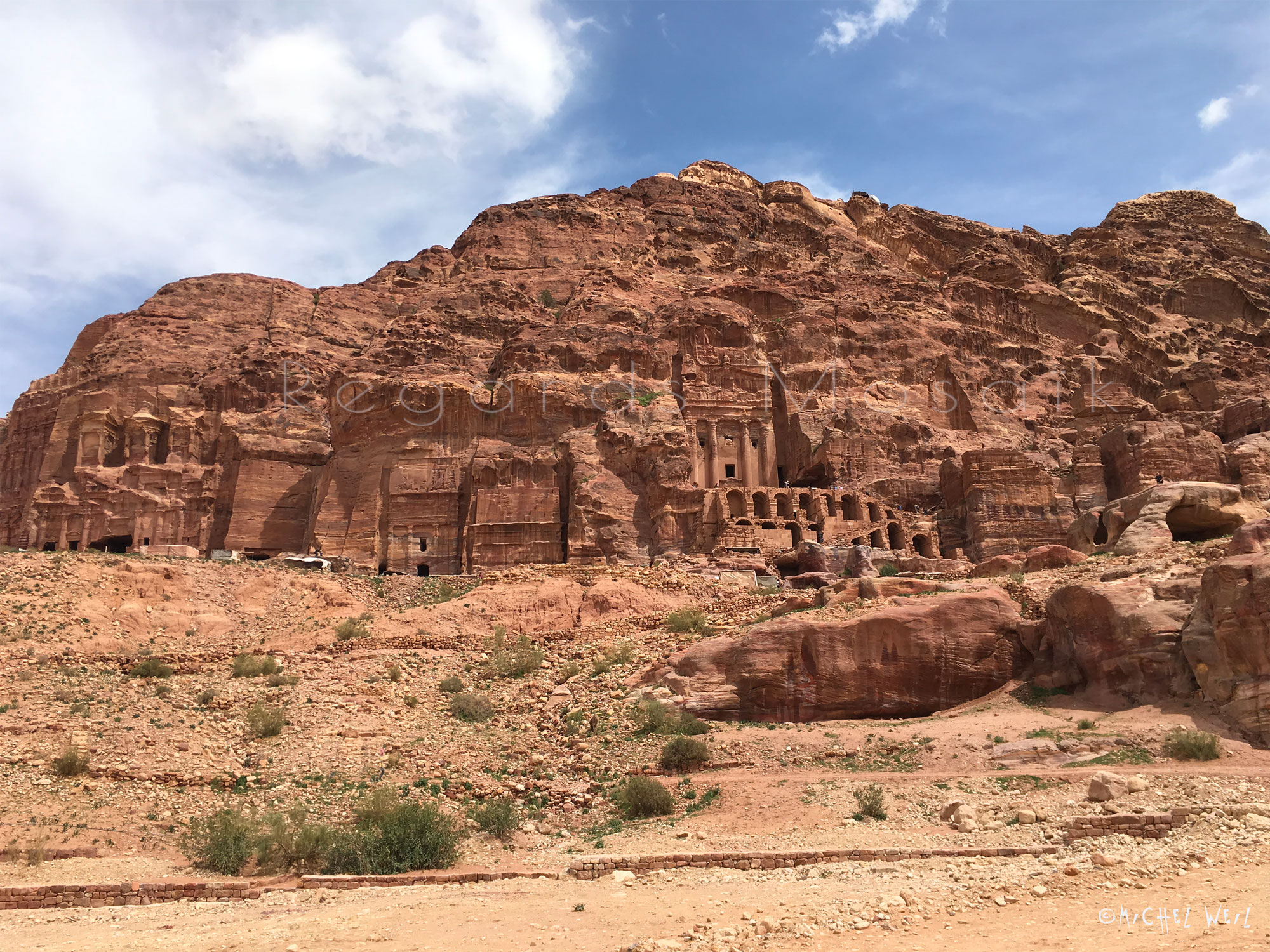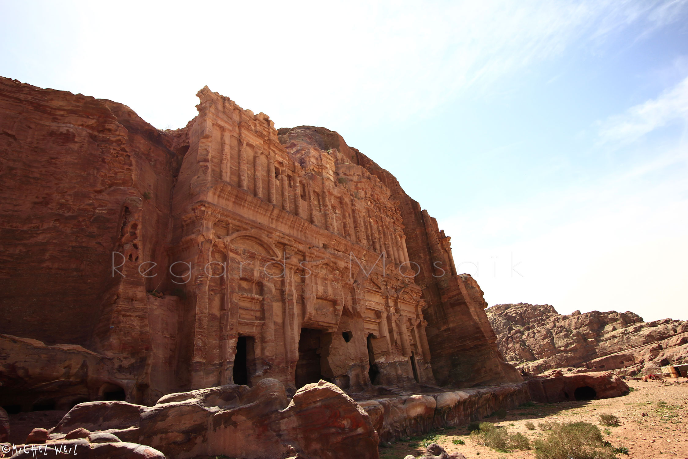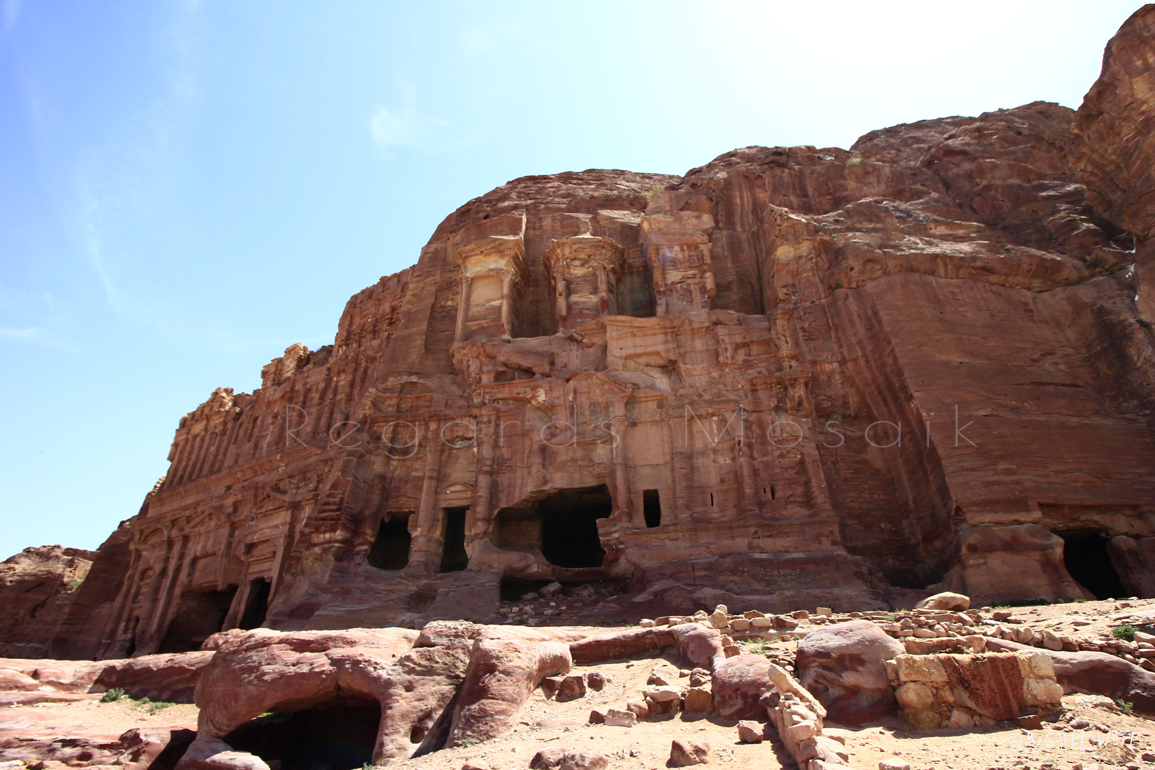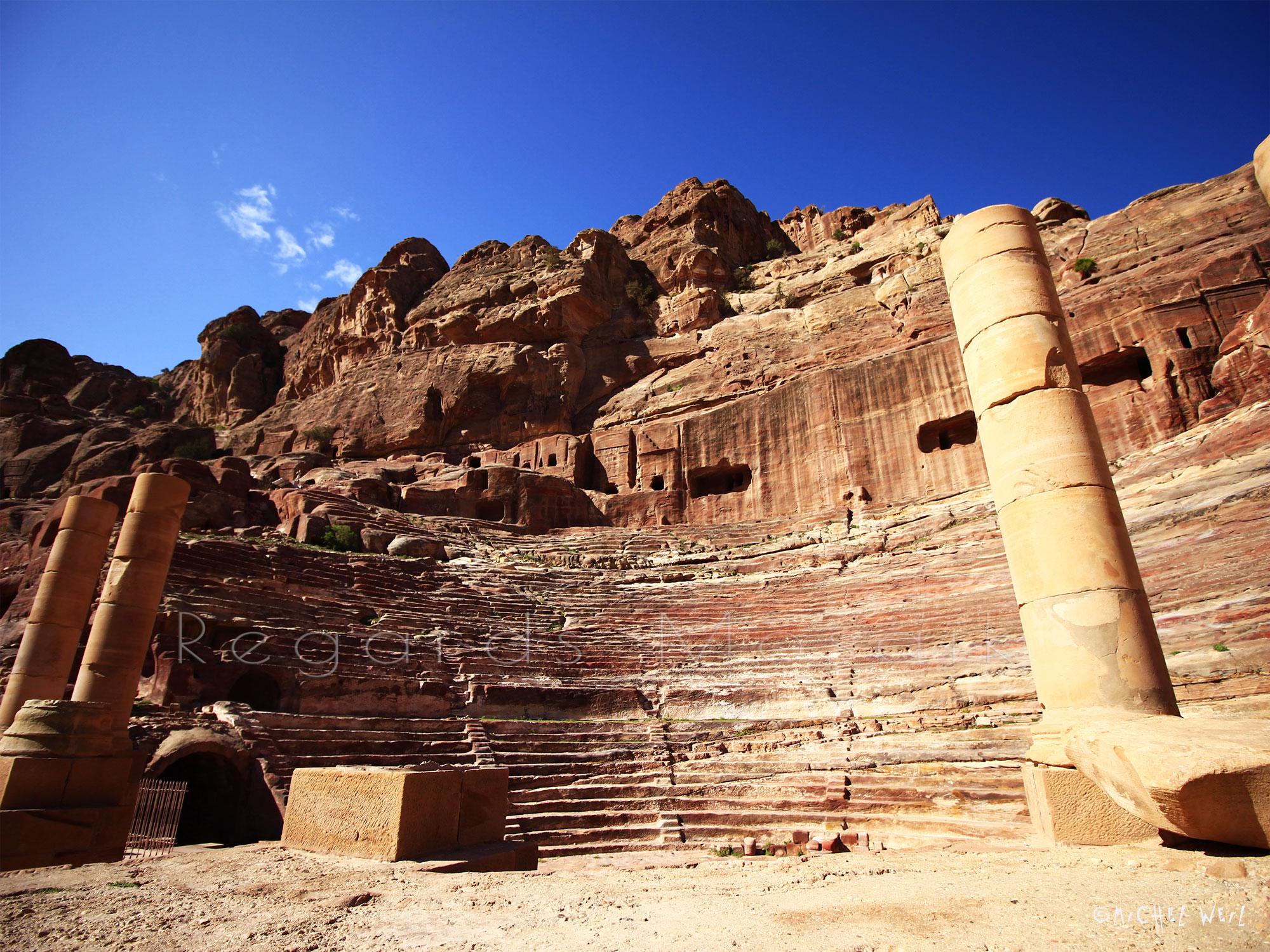 Et l’on découvre partout taillés dans la montagne de nombreux tombeaux ainsi que le théâtre. Le cours du wadi Mousa change d’orientation pour se diriger vers le nord sur quelques centaines de mètres, avant de reprendre son trajet sur un axe est-ouest, là où se trouve le centre de Pétra, avec ses principaux ensembles monumentaux.