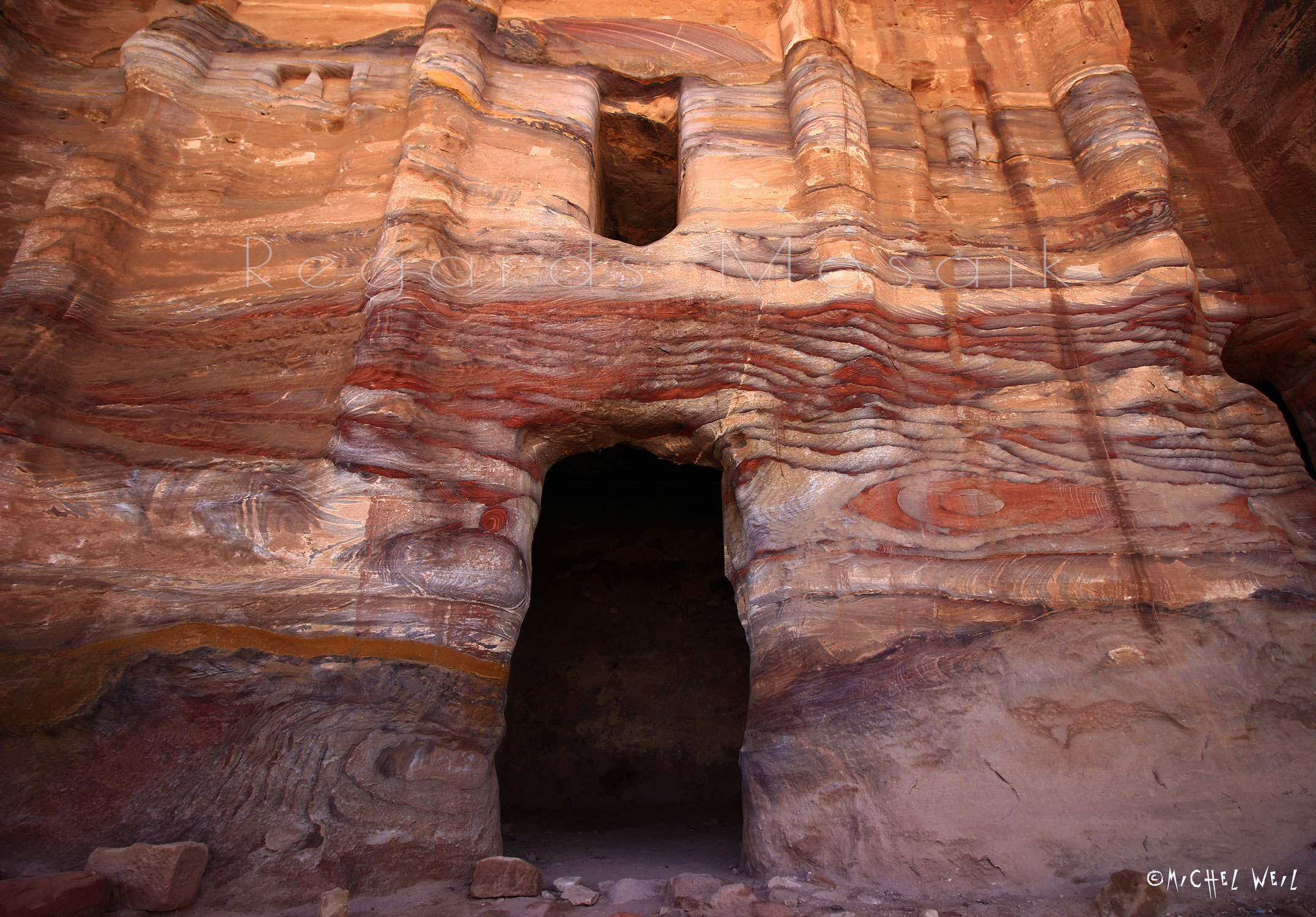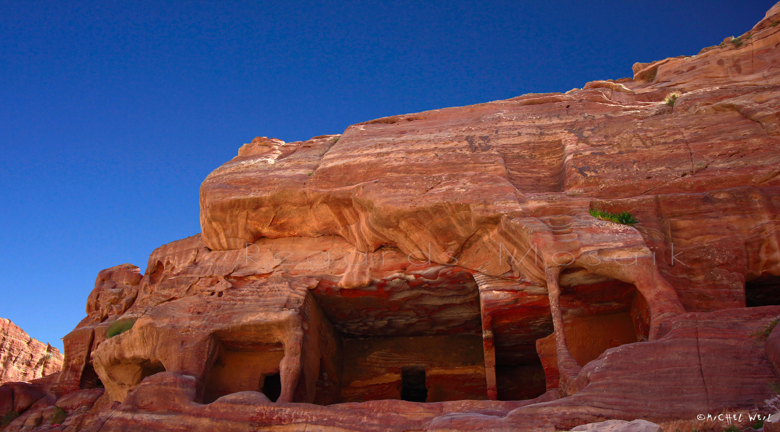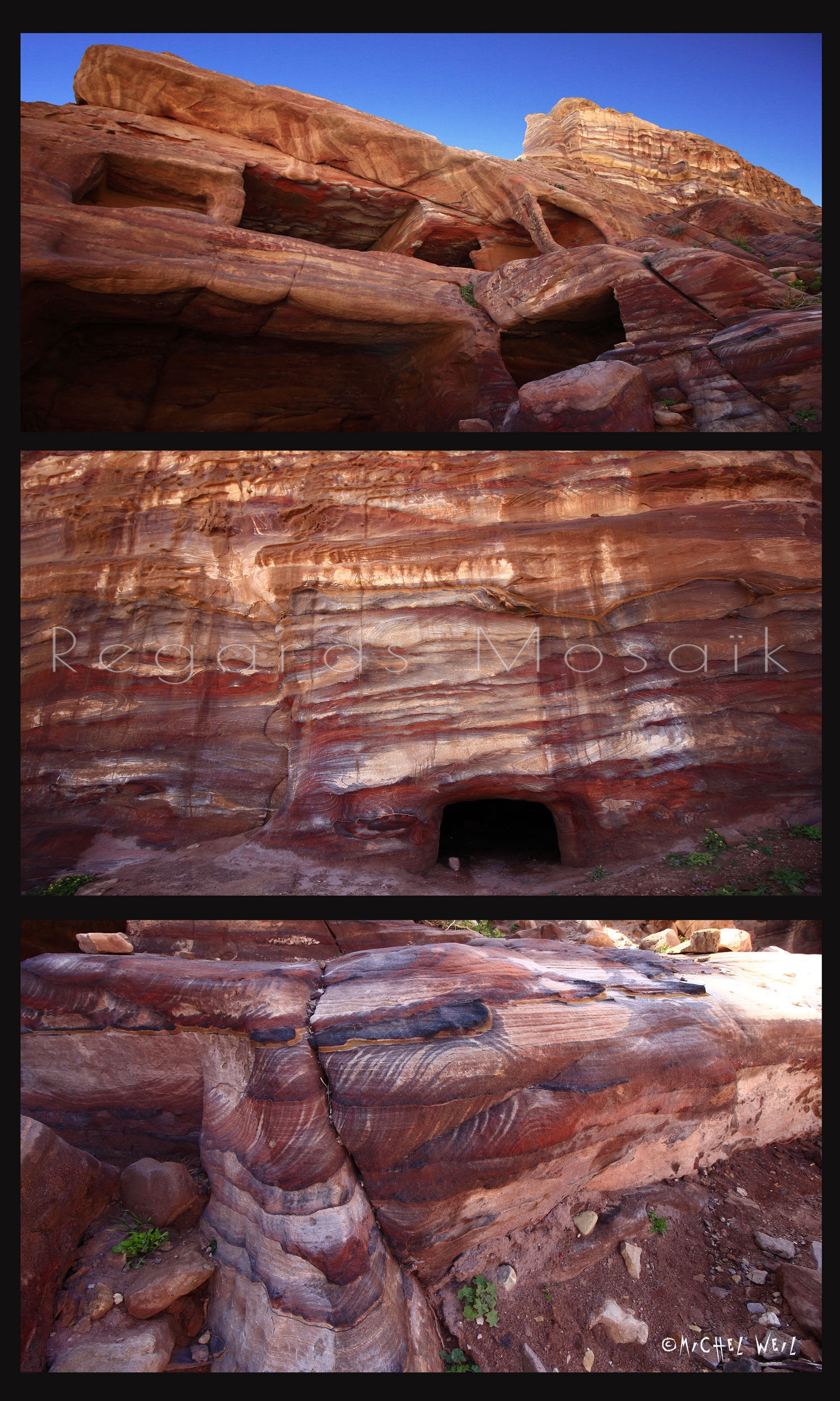 Les roches colorées de Petra. Ces grés de roches déchiquetées, façonnés par le vent et le sable, donnent au site son extraordinaire palette de couleurs qui s’étend du jaune au violet passant par les oranges, roses, rouges, jaunes, verts et bleus. Ces fantastiques couleurs sont dues aux oxydes métalliques contenus dans les grés. Oxydes de fer pour les rouges ou jaunes (comme dans le désert du Wadi Rum), oxydes de cuivre pour les verts et bleus, oxydes de zinc pour les blancs et sulfures pour les jaunes, de manganèse pour le noir…