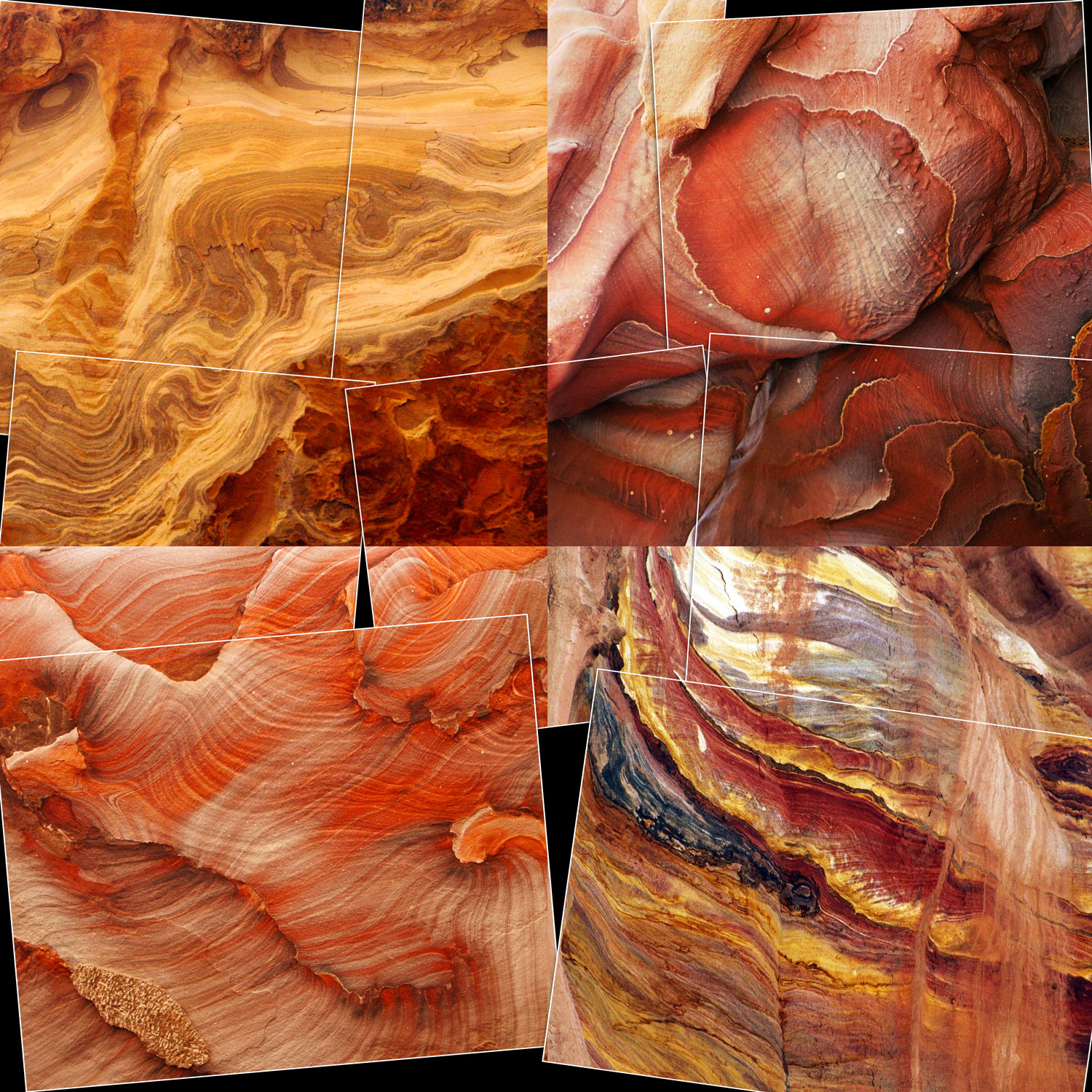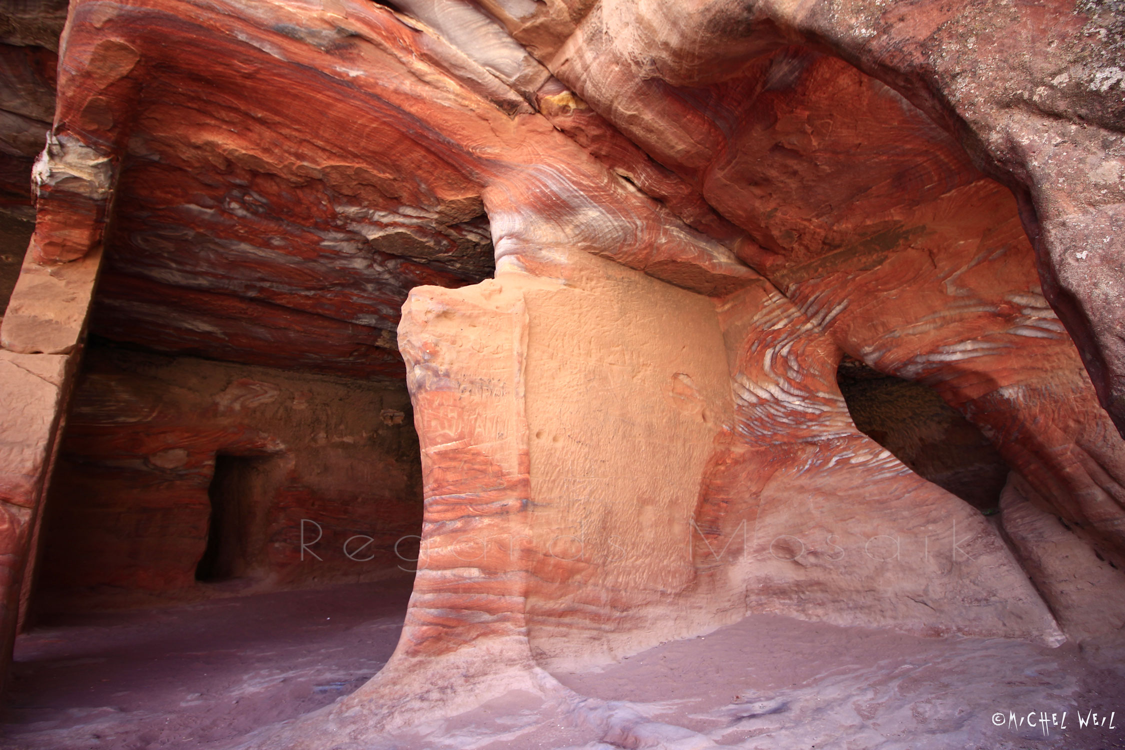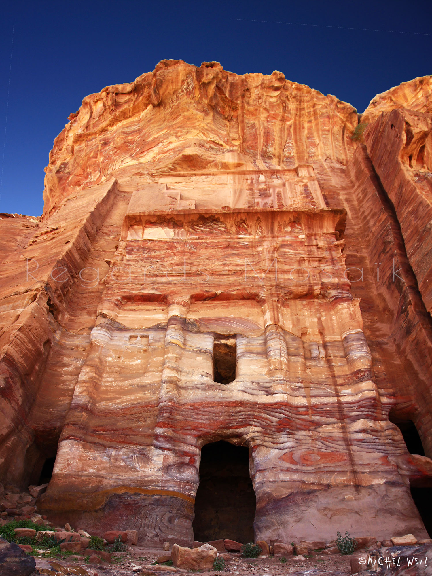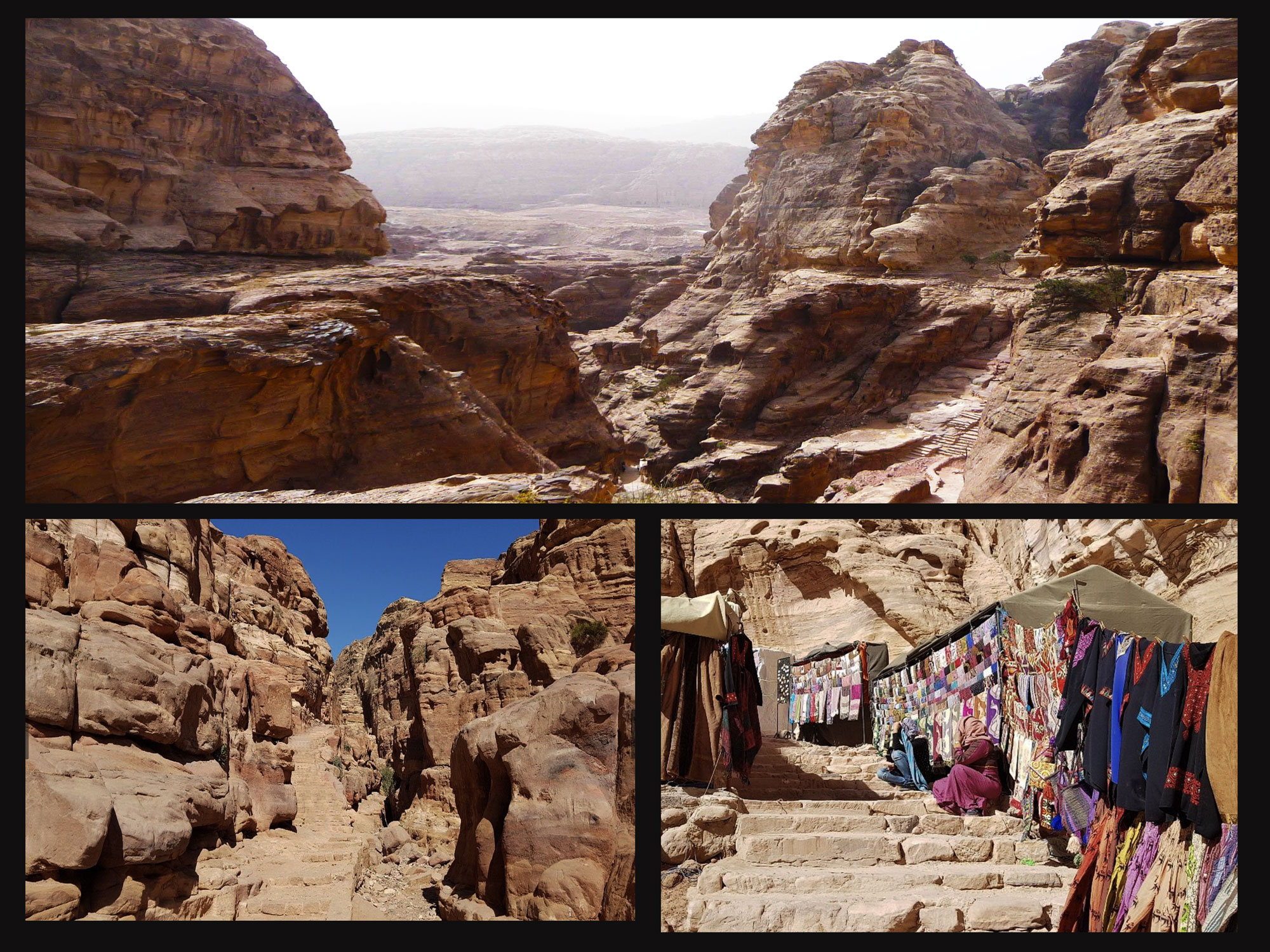 Les roches colorées de Petra. Ces grés de roches déchiquetées, façonnés par le vent et le sable, donnent au site son extraordinaire palette de couleurs qui s’étend du jaune au violet passant par les oranges, roses, rouges, jaunes, verts et bleus. Ces fantastiques couleurs sont dues aux oxydes métalliques contenus dans les grés. Oxydes de fer pour les rouges ou jaunes (comme dans le désert du Wadi Rum), oxydes de cuivre pour les verts et bleus, oxydes de zinc pour les blancs et sulfures pour les jaunes, de manganèse pour le noir…
