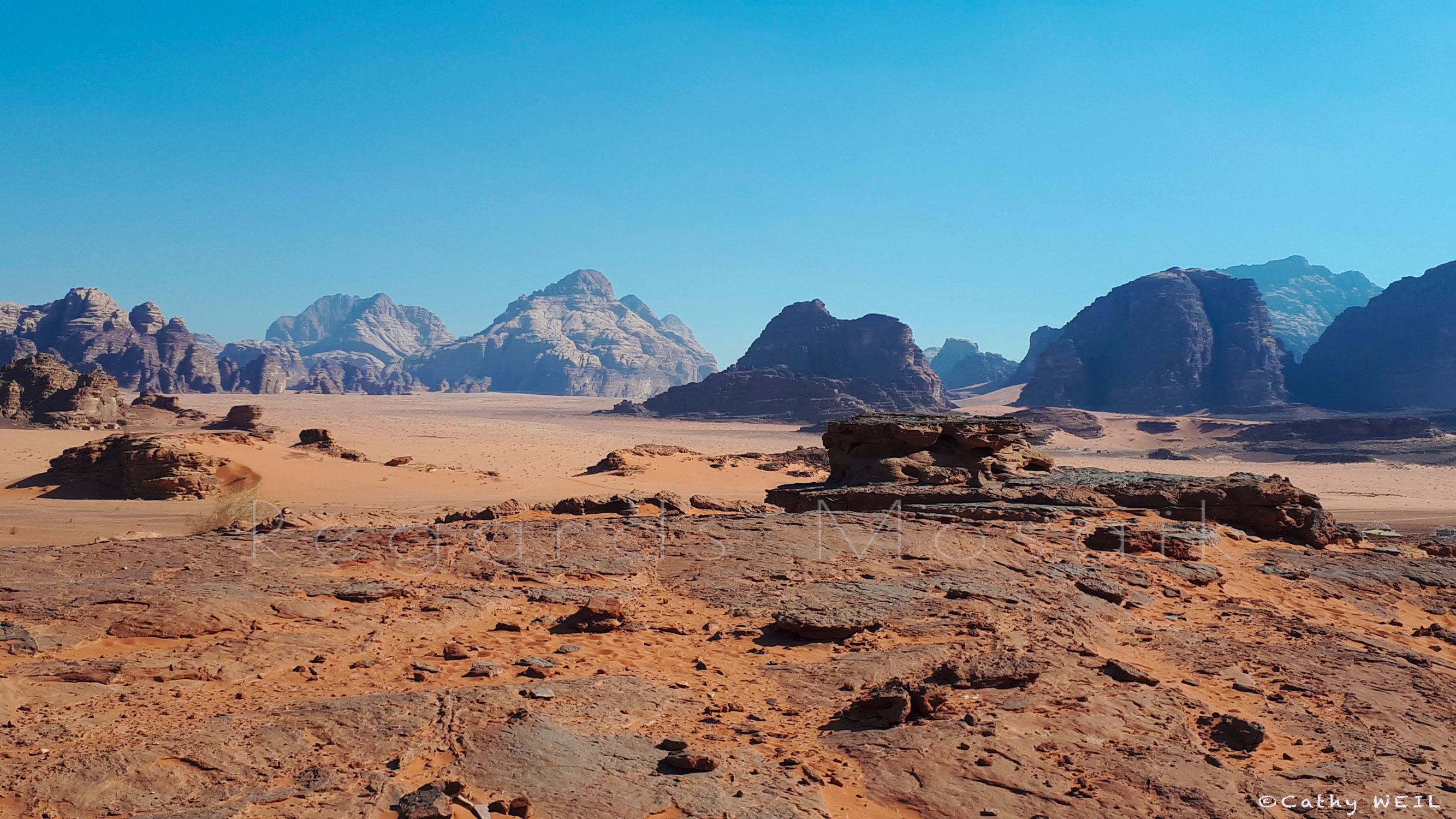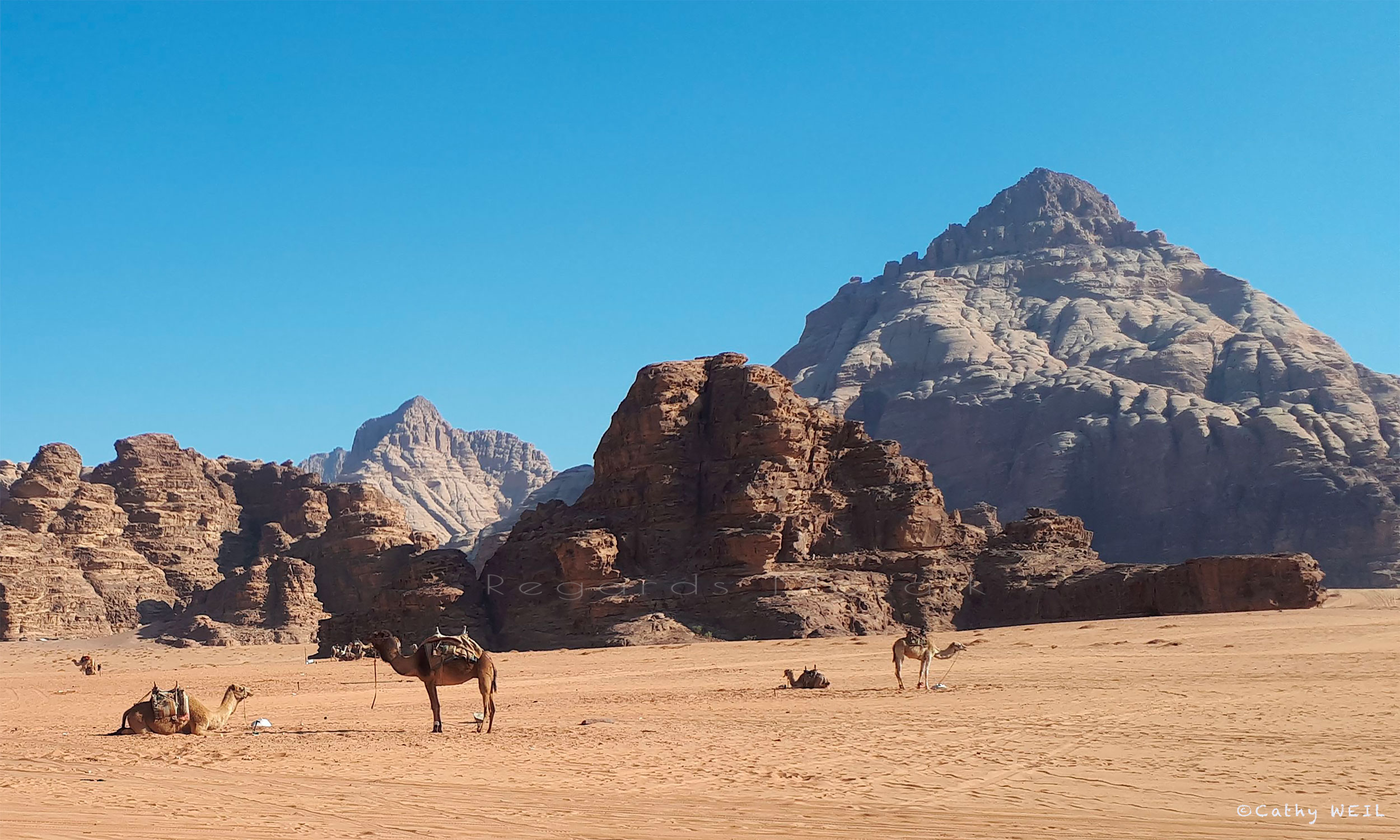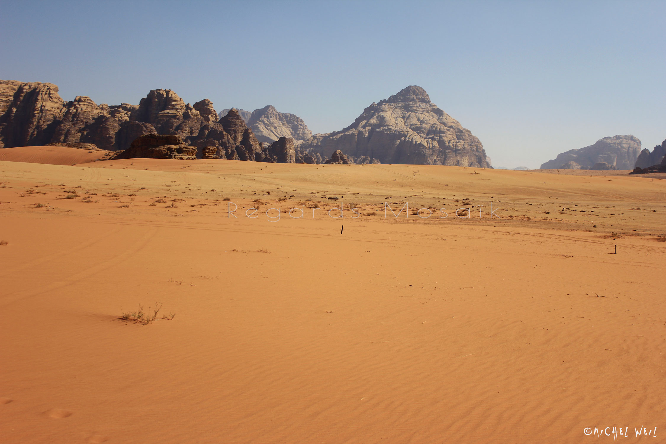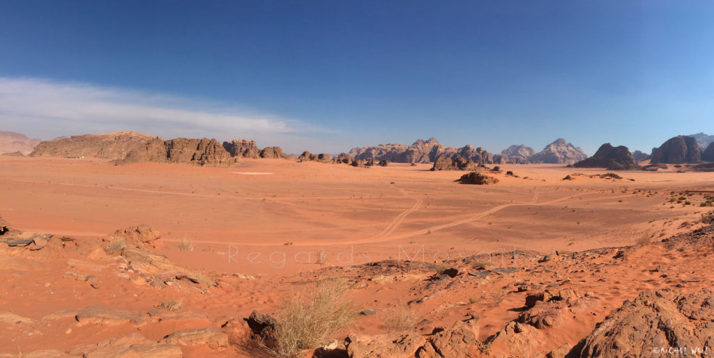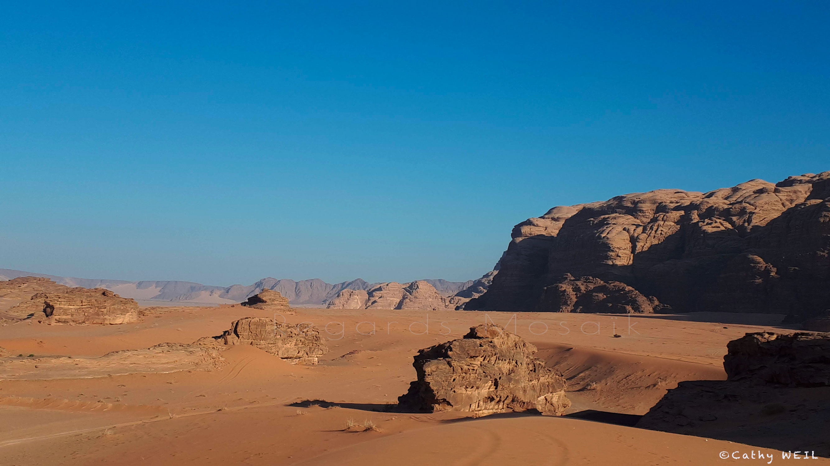 On commence par le fameux rocher des « sept piliers de la sagesse » qui est l’emblème de Wadi Rum, du nom du livre autobiographique de Lawrence d’Arabie.