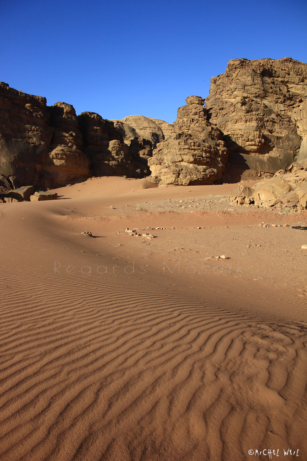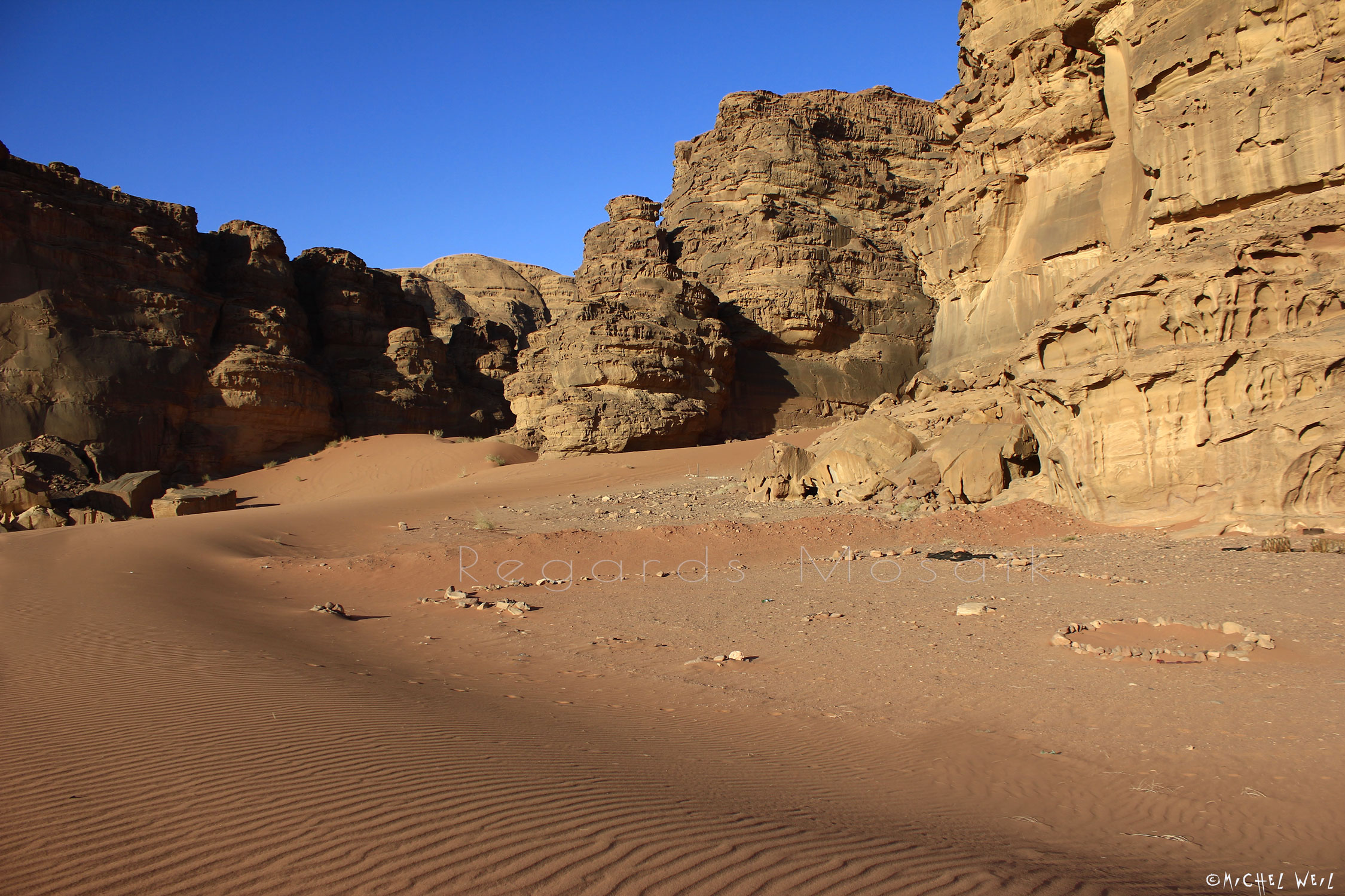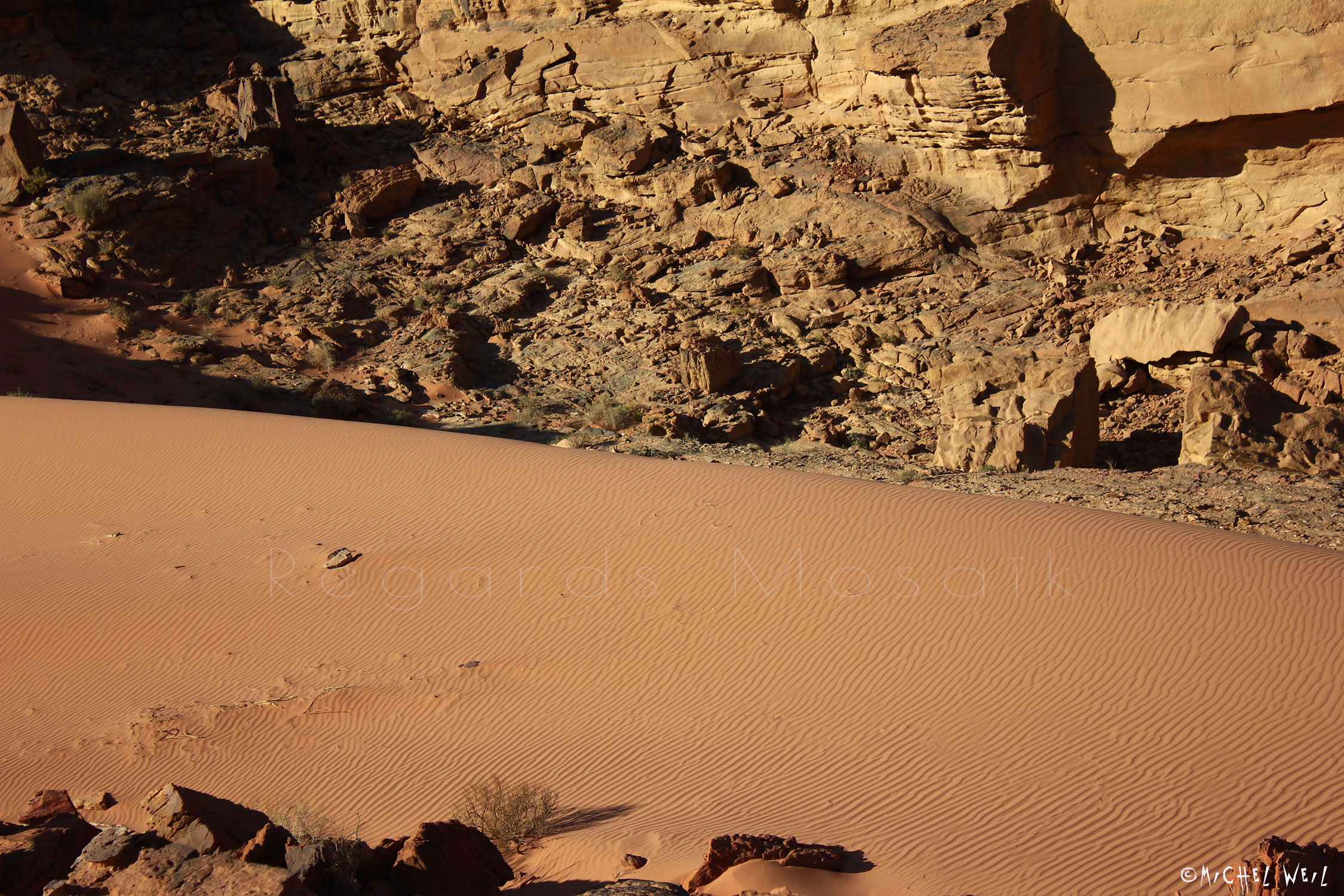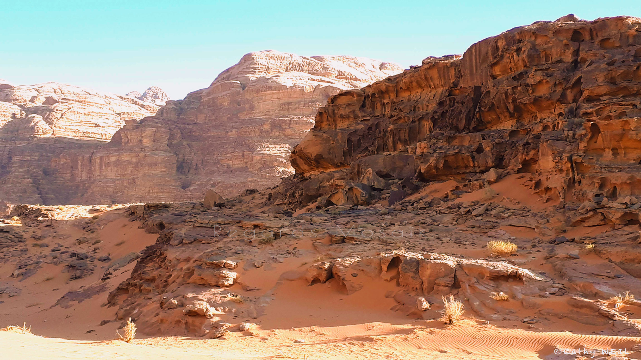 On commence par le fameux rocher des « sept piliers de la sagesse » qui est l’emblème de Wadi Rum, du nom du livre autobiographique de Lawrence d’Arabie.